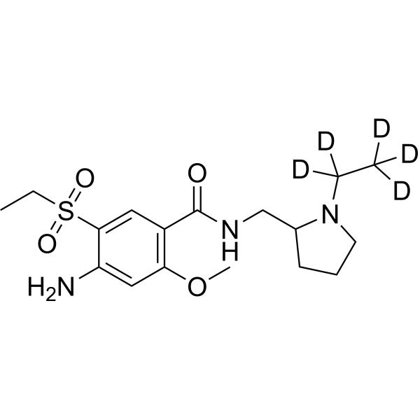 Amisulpride-d5/CAS No.1216626-17-3 is the deuterium labeled Amisulpride. Amisulpride is a dopamine D2/D3 receptor antagonist with Kis of 2.8 and 3.2 nM for human dopamine D2 and D3, respectively.